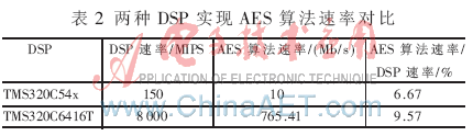 兩種處理器的架構(gòu)和處理速度是不同的,在軟件設計上會有不同的處理方法,若僅考慮DSP速率對算法速率的影響,本系統(tǒng)加密效率更高。另外,本測試僅考慮了AES加密算法代碼的指令開銷,實際中還要考慮DSP存取數(shù)據(jù)、中斷處理等其他任務。