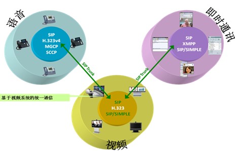 所有的視頻系統(tǒng)采用H.323/SIP方式獨(dú)立存在,網(wǎng)絡(luò)層采用SIP協(xié)議和即時(shí)通訊、語音等進(jìn)行連接,這樣就可以克服視頻終端遷移帶來的種種弊端。這樣做的前提條件,是要在視頻系統(tǒng)里部署一個(gè)視頻通訊服務(wù)器,完成H.323/SIP的轉(zhuǎn)換,完成基于H.323/SIP的雙流和呼叫控制,而不是一個(gè)傳統(tǒng)的H.323的網(wǎng)守可以完成的功能。一個(gè)完整的基于視頻的統(tǒng)一通信系統(tǒng),只有采用這種方式,才可以實(shí)現(xiàn)真正的視頻系統(tǒng)、即時(shí)通信系統(tǒng)、語音系統(tǒng)的統(tǒng)一通信。