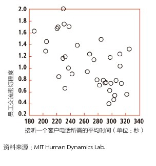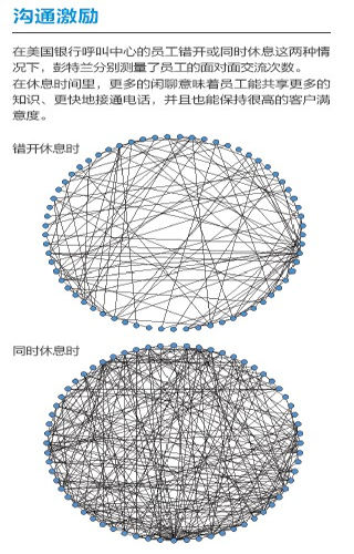 去年,彭特蘭的實(shí)驗(yàn)室與美國銀行(Bank of America)設(shè)在羅得島(Rhode Island)的呼叫中心合作,在80 名中心員工身上安裝了社會(huì)傳感器。這種傳感器看起來像一枚不顯眼的徽章,使用藍(lán)牙和紅外信號監(jiān)測實(shí)驗(yàn)對象每分鐘與哪些同事交談。測試活動(dòng)先開展了一個(gè)月,后來又進(jìn)行了6周。第一個(gè)月后,實(shí)驗(yàn)室的研究人員發(fā)現(xiàn),與更多同事進(jìn)行過交談的員工能夠更快地接通電話,他們自我感覺的壓力也相對較小,而客戶滿意度卻與其他人一樣高。與刻板地遵循員工手冊或服從經(jīng)理的電子郵件指示相比,通過非正式的閑聊來交流問題和解決方案似乎能取得更好的結(jié)果。有了這種結(jié)論之后,該呼叫中心嘗試盡量將員工的休息時(shí)間安排在一起,而非像過去那樣錯(cuò)開。這樣員工就有了更多的時(shí)間參與閑聊。幾個(gè)月后,美國銀行向?qū)嶒?yàn)室報(bào)告了結(jié)果:該呼叫中心獲得了相當(dāng)于每年1,500 萬美元的生產(chǎn)力提升。