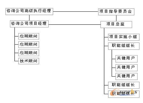 階段2:項(xiàng)目啟動(dòng) 這支隊(duì)伍既有企業(yè)高級(jí)管理層所組成的指導(dǎo)委員會(huì)和咨詢公司人員,也有來自信息部門的技術(shù)人員和相應(yīng)職能部門的熟悉企業(yè)流程的業(yè)務(wù)人員所組成的實(shí)施小組和職能小組。項(xiàng)目隊(duì)伍組織結(jié)構(gòu)如圖所示