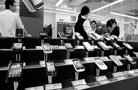 消費(fèi)者在剛剛開業(yè)的福州樂購家電區(qū)選購手機(jī),智能手機(jī)系統(tǒng)和軟件的發(fā)展,正在成為移動互聯(lián)網(wǎng)發(fā)展的“助推器”