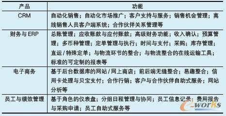NetSuite國(guó)際版是行業(yè)領(lǐng)域首個(gè)也是目前唯一一款能夠支持整個(gè)公司業(yè)務(wù)流程的在線商業(yè)軟件。此產(chǎn)品可以給客戶從客戶關(guān)系管理(CRM)到企業(yè)資源規(guī)劃(ERP)再到網(wǎng)站功能的全面支持(見表1)。