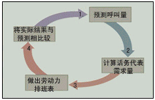 建立呼叫中心勞動(dòng)力管理模式可分成四個(gè)步驟,如圖中的流程圖所示。