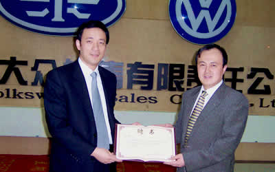 向一汽-大眾客服中心部長(zhǎng)石濤(右)頒發(fā)“副主任委員”聘書(shū)
