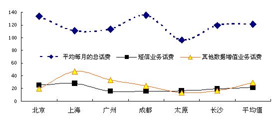 調(diào)查數(shù)據(jù)顯示,在所訪6個城市的手機用戶中,過去三個月平均每個月的話費總額平均為121.3元(以北京和成都的用戶平均總話費較高),其中短信話費平均每月為14.0元,而其它數(shù)據(jù)增值業(yè)務(wù)話費平均話費為4.8元。
