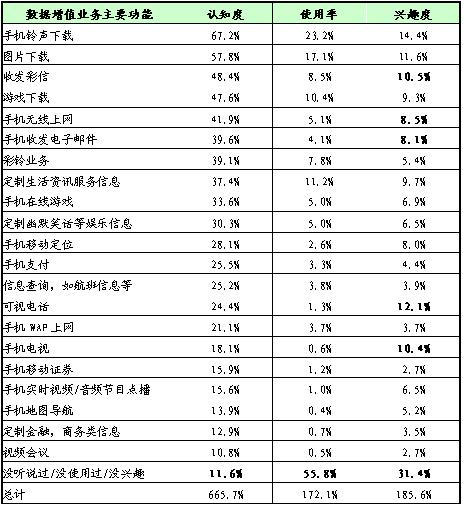 認知度:手機鈴聲下載、圖片下載、收發(fā)彩信、游戲下載、手機無線上網(wǎng)、手機收發(fā)電子郵件、彩鈴業(yè)務(wù)、定制生活資訊服務(wù)信息(新聞、天氣預(yù)報等)等