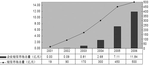 有數(shù)據(jù)顯示,2002年企業(yè)短信市場總量為0.09億元,2003年增長到0.81億元,預計2006年將突破10億元。終于,中國移動和中國聯(lián)通先后推出了面向企業(yè)用戶的“集團短信”業(yè)務,運營商對這個市場的重視使得一個新的產業(yè)鏈逐步完善起來,短信也開始“潤物細無聲”地改變著國內企業(yè)的一些習慣。