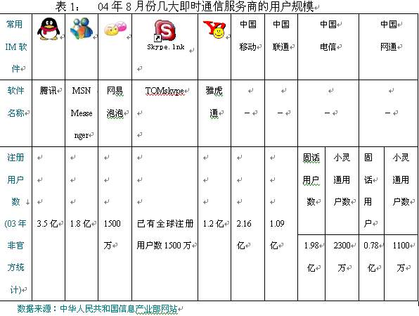 目前國內面向個人的即時通信產品主要有騰訊QQ,微軟MSN,網易泡泡,ICQ,雅虎通以及現在發(fā)展勢頭正猛的TOM-skype等;面向企業(yè)用戶的即時通信產品比較多,但是除了騰訊,微軟等少數運營商用戶比較多以外,其他的推出時間都很短,用戶極少,市場有待進一步開發(fā)。