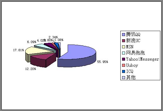 根據(jù)本次報告的“即時通信軟件使用情況分析”,新浪UC僅比排名第二的MSN相差5個百分點,并以超過一倍的相當優(yōu)勢超越排名第四、第五的其他IM軟件。至此,國內(nèi)IM領(lǐng)域已經(jīng)形成了以騰訊QQ、微軟MSN、新浪UC三大巨頭“瓜分天下”的格局,三者之和牢牢掌控了國內(nèi)IM領(lǐng)域?qū)⒔?6%以上的市場份額(圖二)。