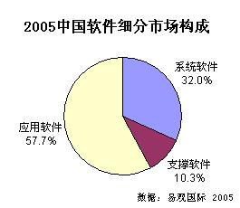 新華美通消息:易觀國(guó)際 發(fā)布的《IT 產(chǎn)品和服務(wù)-中國(guó)軟件市場(chǎng)年度綜合報(bào)告2005-2006》中數(shù)據(jù)顯示,2005年,中國(guó)軟件市場(chǎng)全年銷售額為324.4億元人民幣。同比增長(zhǎng)22.2%。其中,系統(tǒng)軟件市場(chǎng)穩(wěn)定增長(zhǎng),市場(chǎng)規(guī)模達(dá)到103.8億元。支撐軟件市場(chǎng)增速提高,同比增長(zhǎng)25.2%。應(yīng)用軟件市場(chǎng)規(guī)模達(dá)187.3億人民幣,相比2004年的151.2億增長(zhǎng)了23.9%。其中市場(chǎng)對(duì)應(yīng)用軟件的需求量最大,占整個(gè)市場(chǎng)的57.7%。對(duì)系統(tǒng)軟件的需求居第二,占到32.0%,而支撐軟件則需求相對(duì)較小,占到10.3%的份額。