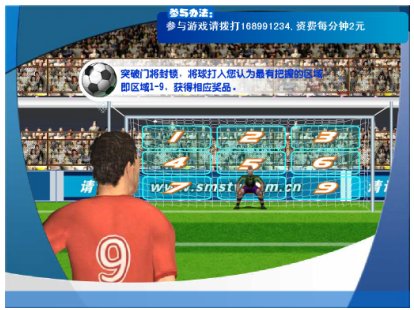 球門分成9個區(qū)域,分別對應(yīng)1-9,你要首先搶到射門權(quán),然想要射哪個區(qū)就按電話機(jī)上對應(yīng)的1-9號鍵或直接在手機(jī)上寫短信SM+區(qū)域號(1-9)發(fā)送到短信號碼,即可完成一次射門,射中后即可可獲得獎品。