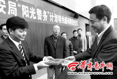 昨日下午2時(shí)許,重慶市公安局“陽光警務(wù)”特約顧問聘請(qǐng)儀式上,重慶市公安局副局長、政治部主任彭長健頒發(fā)了特約顧問聘書。重慶市社會(huì)科學(xué)院研究員孫元明等18人成為我市警方首批聘請(qǐng)的“陽光警務(wù)”特約顧問。他們將作為警方的“智囊團(tuán)”直接參與、監(jiān)督警務(wù)活動(dòng),聘任時(shí)間為兩年。