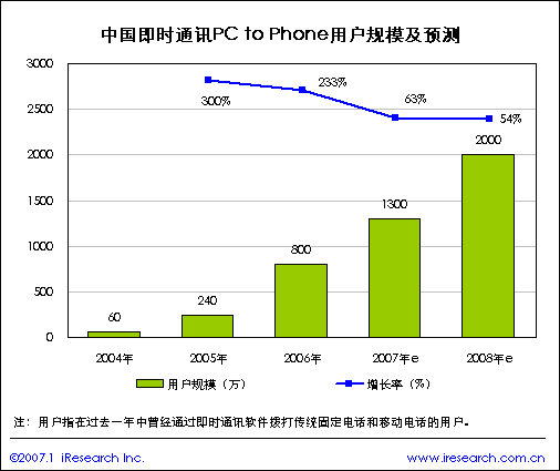 2004年10月以前中國(guó)使用PC to Phone的VOIP用戶(hù)非常少,且主要是使用國(guó)外運(yùn)營(yíng)商提供的服務(wù),像Skype、TELTEL和dialpad等。隨著Skype登錄中國(guó),一些國(guó)內(nèi)公司聯(lián)合地方的電信運(yùn)營(yíng)商以“增值服務(wù)”的形式推出具有PC to Phone功能的即時(shí)通訊軟件。