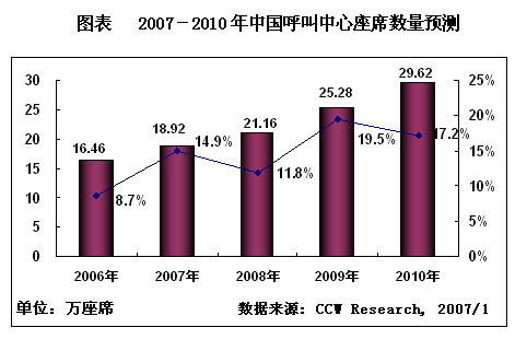 計世資訊(CCW Research)的研究成果《2006-2007年中國呼叫中心市場研究報告》預(yù)計,2007-2010年中國呼叫中心的產(chǎn)業(yè)投入規(guī)模平均年度復(fù)合增長率將超過20%,預(yù)計2007年中國呼叫中心投入規(guī)模將達到337.19億元,同比增長24.8%。由于2007、2009兩個年度中國呼叫中心將開始更換新的系統(tǒng)平臺,并開拓遠程座席市場,因此2007年的呼叫中心座席規(guī)模增長率高于2006年,2009年的呼叫中心座席規(guī)模增長率高于2008年。預(yù)計2007年中國呼叫中心座席數(shù)量將達到18.92萬個,同比增長14.9%;而2006年呼叫中心座席數(shù)量的同比增長率僅僅是8.7%,可見2007年的增長率比2006年的高出6.2個百分點。計世資訊(CCW Research)研究認為,2007年成為中國呼叫中心產(chǎn)業(yè)發(fā)展的轉(zhuǎn)折點,2007年中國開始進入第二波呼叫中心建設(shè)高潮期。