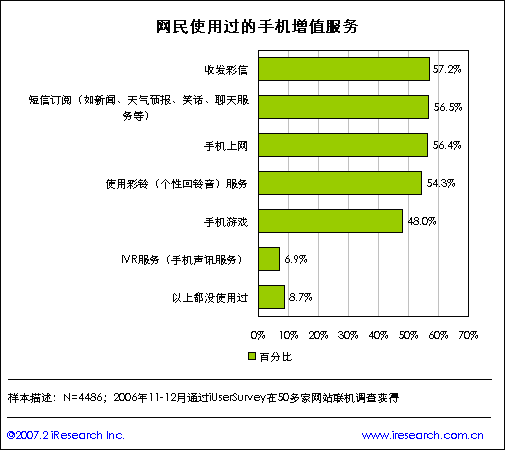 中國移動的增值業(yè)務(wù)已經(jīng)發(fā)展到一個相對成熟的階段,增值業(yè)務(wù)對整體業(yè)務(wù)的貢獻度有望進一步提高,2006年中國移動增值收入比例達到23.5%。中國移動的增值業(yè)務(wù)收入構(gòu)成目前還比較單一,短信占主導(dǎo)。WAP/MMS/Java等2.5G業(yè)務(wù)將從2007年開始進入高速發(fā)展階段,而CRBT和IVR則將逐漸進入成熟期與調(diào)整期,增長速度趨緩。iResearch艾瑞市場咨詢通過對用戶研究發(fā)現(xiàn),彩信、短信、WAP、彩鈴及手機游戲最受用戶青睞,彩信、短信訂閱、手機上網(wǎng)、彩鈴及手機游戲是用戶使用最多的移動增值業(yè)務(wù)。
