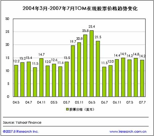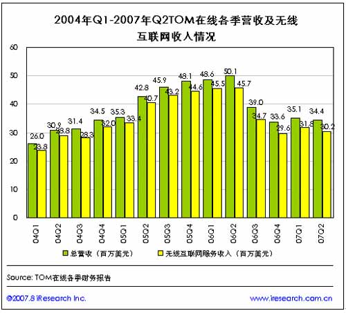 在2006年第二季度總營收以及無線互聯(lián)網(wǎng)服務(wù)收入分別達(dá)到歷史最高點(分別達(dá)到5010萬美元和4571萬美元)之后,TOM在線各季收入及無線互聯(lián)網(wǎng)收入呈逐季下滑趨勢,至2007年第二季度,TOM在線的總營收為3439萬美元,來自無線互聯(lián)網(wǎng)服務(wù)的收入為3024萬美元!
