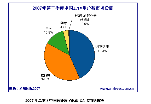 易觀國際研究表明,2007年第2季度中國IPTV用戶數(shù)達(dá)到73.6萬,根據(jù)各廠商中標(biāo)業(yè)務(wù)區(qū)實(shí)際發(fā)展的用戶數(shù)排名,UT斯達(dá)康占據(jù)第一,河南廠商威科姆占據(jù)第二,中興通訊位居第三。