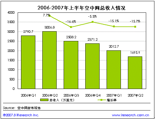 空中網(wǎng)2007年第二季度財報數(shù)據(jù)顯示,第二季度空中網(wǎng)的總收入1695.9萬美元,同比負增長43.6%,環(huán)比負增長15.7%。與第一季度相比在空中網(wǎng)兩個產(chǎn)品平臺的主要2G業(yè)務(wù)和2.5G的業(yè)務(wù)收入都出現(xiàn)了不同程度的下降,但2G業(yè)務(wù)中的IVR業(yè)務(wù)收入則出現(xiàn)了大幅上升。
