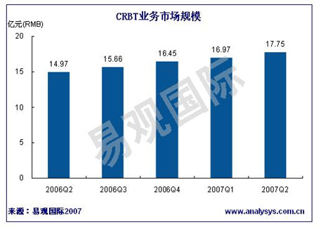 易觀國(guó)際研究表明,2007年第2季度中國(guó)彩鈴業(yè)務(wù)市場(chǎng)規(guī)模達(dá)到17.75億人民幣,同比增長(zhǎng)18.54%。其中對(duì)無(wú)線音樂(lè)平臺(tái)的持續(xù)投入和推廣使中國(guó)移動(dòng)彩鈴業(yè)務(wù)穩(wěn)步增長(zhǎng),其彩鈴市場(chǎng)規(guī)模為13.27億人民幣,同比增長(zhǎng)19.77%。中國(guó)聯(lián)通彩鈴市場(chǎng)規(guī)模為4.48億元,同比上升15.17%。