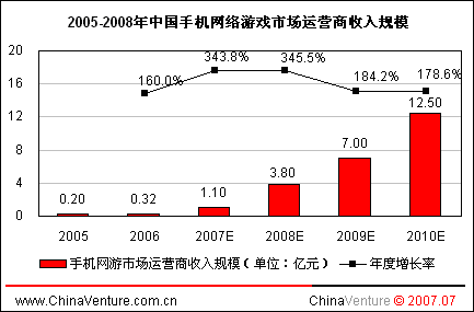 手機(jī)網(wǎng)游業(yè)務(wù)經(jīng)過近幾年培育,市場規(guī)模逐步擴(kuò)大。隨著用戶認(rèn)知度和普及率逐步提高,未來將成為游戲產(chǎn)業(yè)新的增長點(diǎn)。代表手機(jī)游戲未來發(fā)展方向的手機(jī)網(wǎng)游市場必將在2008年和2009年開始獲得風(fēng)險(xiǎn)投資商的廣泛關(guān)注。