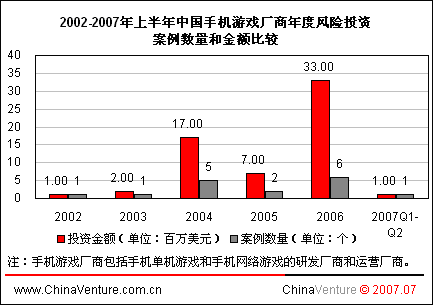 ChinaVenture分析師指出,除2006年觸通安騰和掌上明珠依靠手機(jī)網(wǎng)游業(yè)務(wù)獲得數(shù)百萬美元投資外,其余企業(yè)獲融資原因均為投資商看好手機(jī)單機(jī)游戲業(yè)務(wù)。2007年之前由于手機(jī)網(wǎng)游市場規(guī)模過小,加上無線網(wǎng)絡(luò)環(huán)境制約,風(fēng)險(xiǎn)投資商大多抱以觀望態(tài)度。