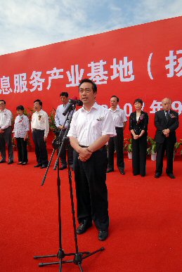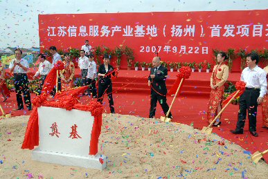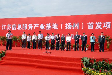 日前,江蘇信息服務(wù)產(chǎn)業(yè)基地(揚(yáng)州)首發(fā)項目開工典禮在廣陵新城隆重舉行,這標(biāo)志著產(chǎn)業(yè)基地建設(shè)邁入了實質(zhì)性階段。揚(yáng)州市人民政府市長王燕文和天津泰達(dá)公司董事長劉惠文為奠基石揭幕,市委常委、常務(wù)副市長王榮平致賀詞,江蘇省信息產(chǎn)業(yè)廳副廳長龔懷進(jìn)出席了開工典禮。