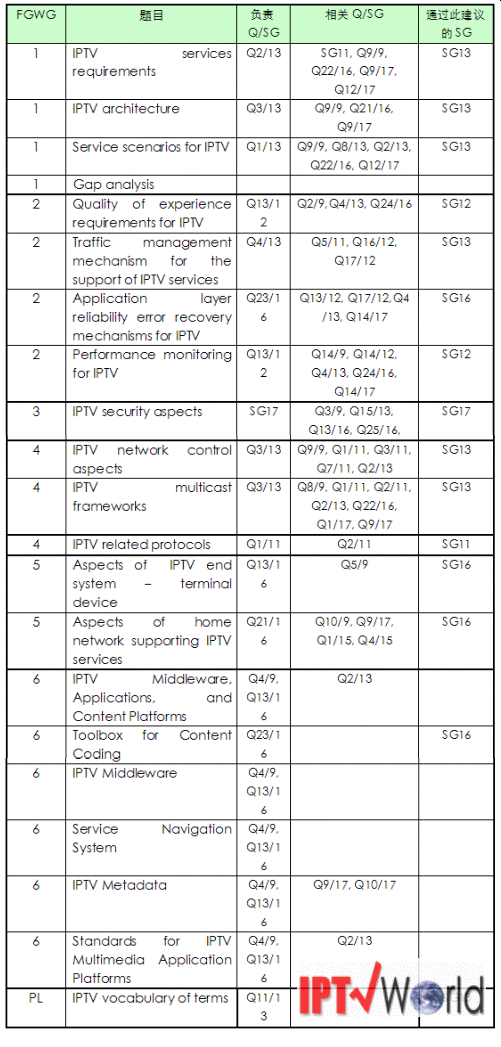 表2:FG IPTV輸出的工作文檔以及負責此文檔后續(xù)工作的ITU-T研究組