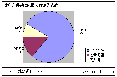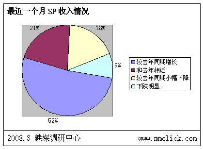 最近公布的空中網(wǎng)財務(wù)報表的數(shù)據(jù)顯示空中網(wǎng)總收入環(huán)比增長,結(jié)合之前廣東移動推出:廣東移動向重服務(wù)轉(zhuǎn)變 首推“6+1”服務(wù),SP行業(yè)可以說是暖風(fēng)頻吹。魅媒無線行業(yè)調(diào)研中心隨機(jī)從3月3日到3月5日隨記電話采訪50多家全網(wǎng)以及廣東省網(wǎng)SP公司相關(guān)負(fù)責(zé)人,對最近的SP行業(yè)的政策調(diào)整進(jìn)行調(diào)查,有以下的數(shù)據(jù):