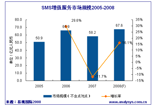 2007年SMS增值服務(wù)的市場規(guī)模(不含點對點)達到58.2億,環(huán)比下降了11.7% ,市場下降的主要原因包括: