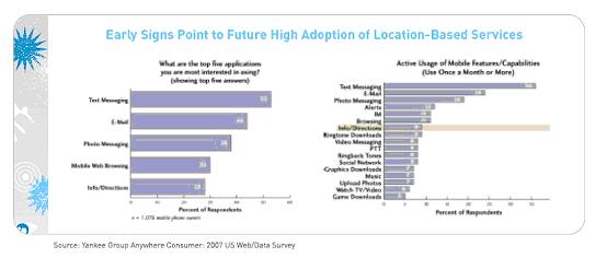 當(dāng)美國聯(lián)邦通信委員會(FCC)在2001年強(qiáng)制要求實(shí)施911增強(qiáng)功能時(shí),移動行業(yè)就開始通過將導(dǎo)航服務(wù)引入大眾市場來獲利。7年后,絕大多數(shù)手機(jī)都集成了GPS功能,幾大主要的移動運(yùn)營商也都計(jì)劃在年內(nèi)推出至少一項(xiàng)基于GPS 的導(dǎo)航應(yīng)用。揚(yáng)基集團(tuán)認(rèn)為,2008年正在成為美位置服務(wù)的轉(zhuǎn)折點(diǎn)。