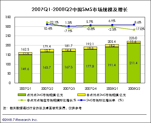08Q3中國短信市場規(guī)模將繼續(xù)保持增長,非點對點業(yè)務(wù)下滑放緩