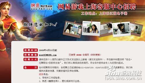 網(wǎng)易表示,招聘將從2009年4月21日起正式開始,將提供優(yōu)厚的待遇、完善的福利及勞動保障。截至21日0時,該頁面顯示網(wǎng)易已接收到6048份簡歷。