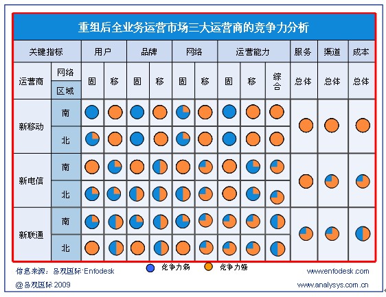 盡管產(chǎn)業(yè)鏈完備程度相差較為明顯,但運(yùn)營(yíng)商各自業(yè)務(wù)與用戶服務(wù)運(yùn)營(yíng)能力對(duì)3G時(shí)常的發(fā)展影響也至關(guān)重要,根據(jù)易觀國(guó)際Enfodesk發(fā)布的《國(guó)內(nèi)運(yùn)營(yíng)商3G業(yè)務(wù)發(fā)展策略研究系列—中國(guó)3G市場(chǎng)現(xiàn)狀與發(fā)展策略概述》報(bào)告顯示,在發(fā)展3G的過(guò)程中,三大運(yùn)營(yíng)商各自有一定的優(yōu)劣勢(shì):