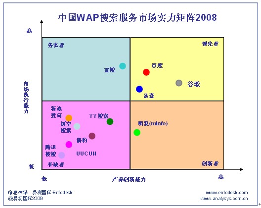 2008年WAP搜索市場(chǎng)中處于務(wù)實(shí)者象限的主要廠商是宜搜。2008年宜搜年收入占整個(gè)WAP搜索市場(chǎng)的36%。這主要?dú)w因于宜搜在整個(gè)2008年在市場(chǎng)推廣和營銷方面投入了大量的人力以及資金投入。