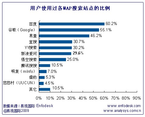 據(jù)易觀國(guó)際(Analysys International)《中國(guó)移動(dòng)搜索市場(chǎng)用戶調(diào)研報(bào)告2009》研究發(fā)現(xiàn)此次調(diào)研樣本用戶使用過(guò)的各WAP搜索站點(diǎn)比例情況基本可以分為三個(gè)梯隊(duì):