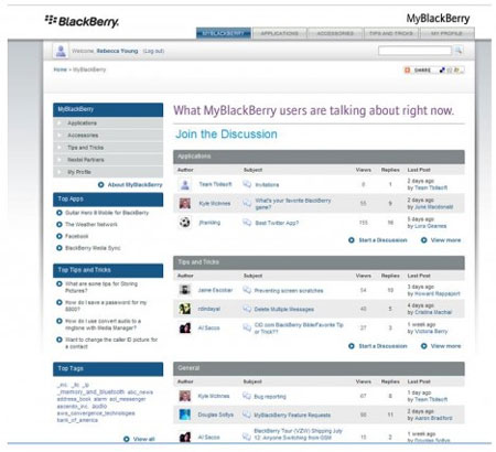 從某種程度而言,MyBlackBerry并不是一個真正的社交網(wǎng)站,而更像一個用戶留言板。網(wǎng)站具有一定的針對性,允許使用同型號設備的用戶進行交流。例如,使用BlackBerry