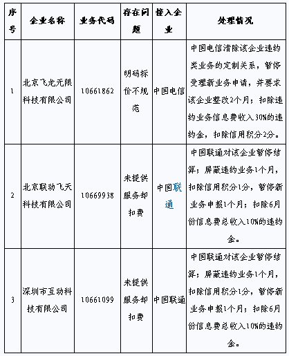 據(jù)悉,這3家增值電信企業(yè)是北京飛龍無限科技有限公司,存在明碼標(biāo)價不規(guī)范問題;北京聯(lián)動飛天科技有限公司,未提供服務(wù)卻扣費;深圳市互動科技有限公司,未提供服務(wù)卻扣費。