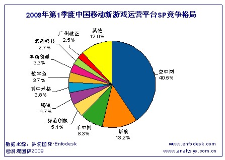 據易觀國際Enfodesk產業(yè)數據庫中《2009年第2季度中國手機游戲市場季度監(jiān)測》顯示:2009年第1季度中國移動的手機游戲服務信息費收入達1.86億人民幣,其中中國移動新游戲運營管理平臺的信息費收入占總體收入的12.41%,達2310萬元人民幣。