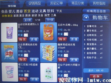 記者在家樂福IPTV購物平臺(tái)上看到,商品的種類相當(dāng)豐富,按日常用到的分成了食品、嬰兒、美容、百貨、運(yùn)動(dòng)、文具、飲料幾個(gè)大類,而每一類里又分成不同的小類,比如美容類里又分護(hù)膚、清潔、男士、彩妝、紙巾等小類。其價(jià)格與在家樂福購物相同,并且還有不少產(chǎn)品在打折。滿118元即可免費(fèi)配送,對于沒有時(shí)間、精力逛超市的人來講,可以說相當(dāng)方便。
