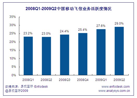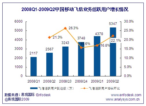 飛信用戶(hù)到達(dá)數(shù)的增長(zhǎng)帶來(lái)了活躍用戶(hù)的穩(wěn)步提升,截止到2009年第2季度,飛信活躍用戶(hù)達(dá)到了5347萬(wàn),與2008年同期相比增長(zhǎng)超過(guò)108.3%。由于一方面飛信到達(dá)數(shù)增長(zhǎng)環(huán)比從2008年第2季度持續(xù)下跌,在2009年第2季度才止跌反彈,相比另一方面飛信活躍用戶(hù)的增長(zhǎng)環(huán)比始終保持在15%以上,且從2008年第4季度開(kāi)始飛信活躍用戶(hù)增幅持續(xù)擴(kuò)大,因此近期飛信業(yè)務(wù)用戶(hù)活躍度表現(xiàn)出良好的增長(zhǎng)勢(shì)頭。