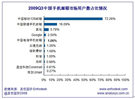 易觀:中移動(dòng)139郵箱領(lǐng)跑2009Q3手機(jī)郵箱市場