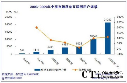 2009年移動(dòng)互聯(lián)網(wǎng)用戶將超2億,與2008年的1.005億用戶數(shù)相比,年增長率達(dá)111.78%。用戶數(shù)量增長的同事,移動(dòng)互聯(lián)網(wǎng)用戶主動(dòng)需求也日趨旺盛,尤其表現(xiàn)在手機(jī)網(wǎng)游、手機(jī)閱讀、手機(jī)證券、移動(dòng)微博等細(xì)分領(lǐng)域方面,用戶多樣化需求也間接引導(dǎo)移動(dòng)互聯(lián)網(wǎng)應(yīng)用服務(wù)的快速發(fā)展。