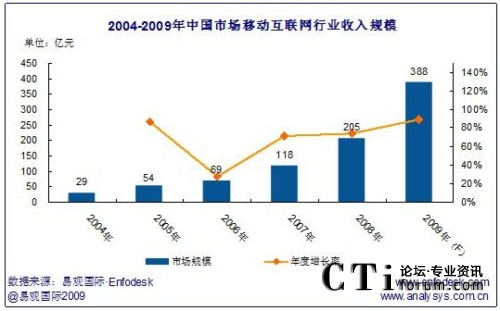 2009年中國市場(chǎng)移動(dòng)互聯(lián)網(wǎng)行業(yè)收入規(guī)模將達(dá)388億,年增長率達(dá)111.78%。