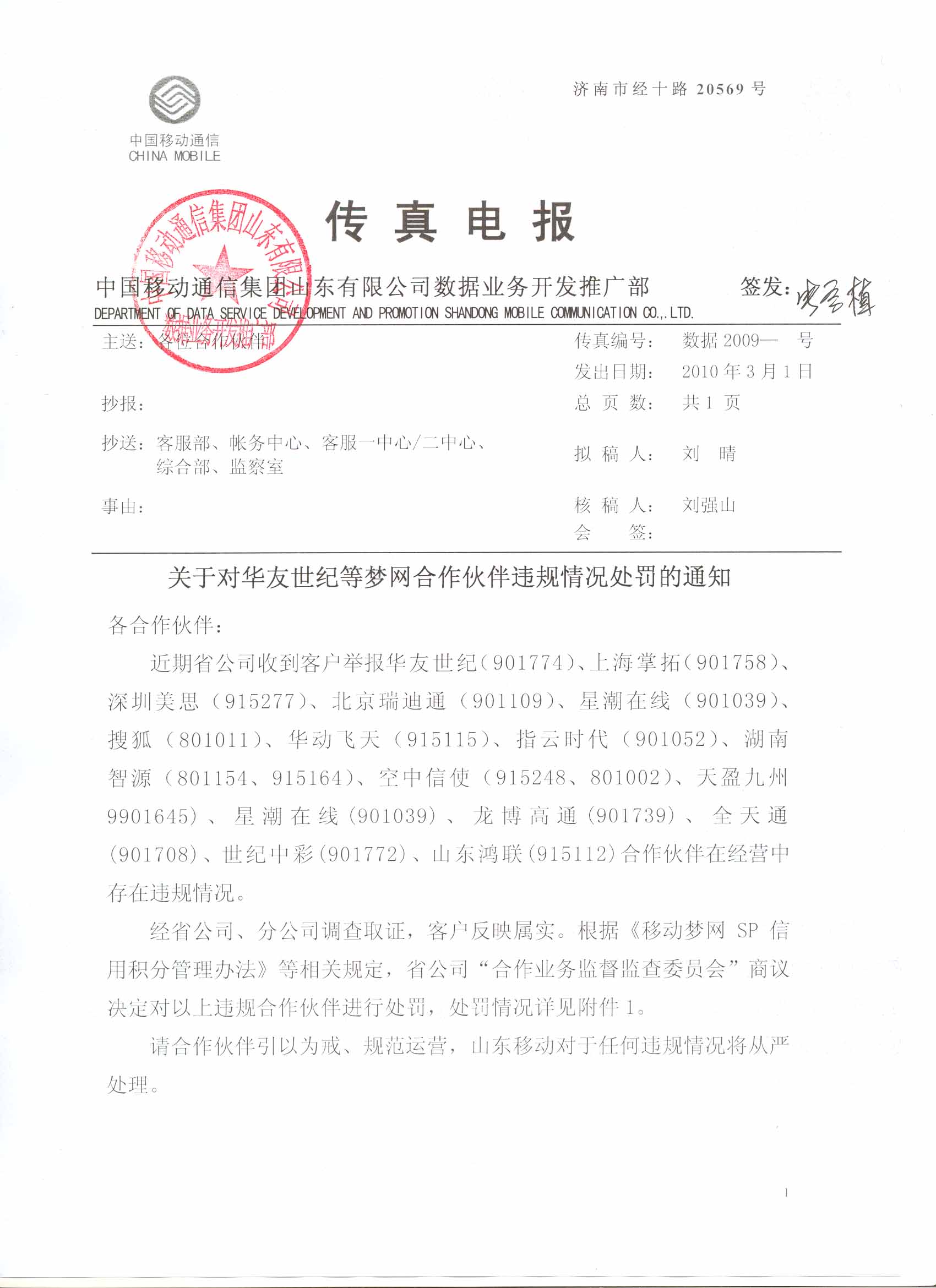 | 12 | 星潮在線 | 901039 | 10665366 | 該公司“生活服務(wù)”業(yè)務(wù),提供代收費(fèi)服務(wù)。 | 暫停該公司“生活服務(wù)”業(yè)務(wù)(業(yè)務(wù)代碼:XXSHFF )在山東地區(qū)的服務(wù)2個(gè)月?鄢庞梅e分20分。 |