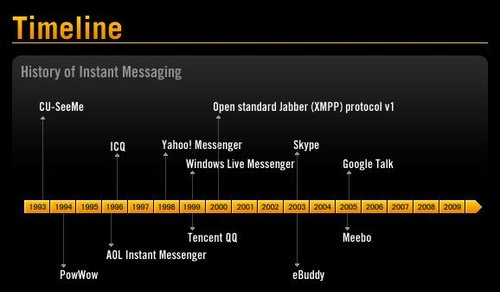 最早的幾款即時通訊工具是1993年推出的CU-SeeMe、1994年推出的PowWow、1996年推出的AOL即時通訊工具和ICQ。而“Instant Messenger”(“即時通訊工具”)這個注冊標志由AOL擁有。
