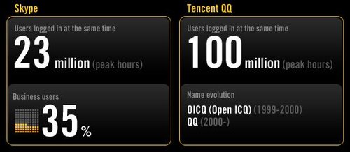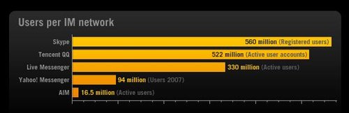 用戶最多的即時通訊工具包括:Skype(5.6億注冊用戶)、騰訊QQ(5.22億活躍用戶帳戶)、MSN(3.3億活躍用戶)、雅虎通(9400萬用戶--2007年數據)。