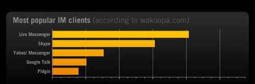 根據wakoopa.com的數據,全球最受歡迎的即時通訊客戶端依次為:MSN、Skype、雅虎通、GTalk、Pidgin。