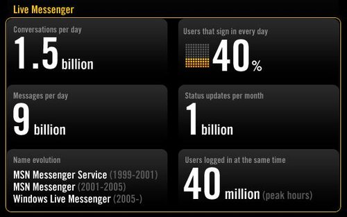 關于微軟MSN的數據為:每天產生的溝通次數為15億,每天產生的消息為90億條。每月簽名檔消息更新量為10億條。每天都登陸的用戶比例為40%,同時在線人數最高值為4000萬。