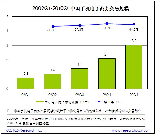 根據(jù)艾瑞咨詢即將發(fā)布的2010年第一季度中國移動互聯(lián)網(wǎng)市場數(shù)據(jù)顯示,2010Q1中國移動互聯(lián)網(wǎng)市場整體交易規(guī)模達到44.9億,環(huán)比增長5.2%。艾瑞咨詢分析認為,盡管電信運營商計費政策調(diào)整,對移動增值市場收入產(chǎn)生負面影響,但是手機電子商務(wù)、手機搜索等業(yè)務(wù)領(lǐng)域的良好市場表現(xiàn),推動移動互聯(lián)網(wǎng)市場規(guī)模平穩(wěn)增長。