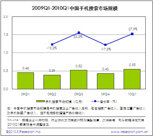 2010Q1中國手機搜索市場規(guī)模為5500萬,環(huán)比增長27.9%,手機搜索請求量和PV的大幅增長帶動廣告收入增加。自2009年下半年以來,受手機上網(wǎng)用戶規(guī)模迅速發(fā)展以及用戶活躍度和黏性顯著增加的影響,手機搜索市場進入快速發(fā)展階段。與此同時,手機搜索企業(yè)紛紛加大市場投入力度,建立與電信運營商和手機終端廠商的深度合作關(guān)系是業(yè)務(wù)拓展的重點方向。此外,網(wǎng)頁產(chǎn)品和客戶端軟件深度整合也是手機搜索企業(yè)布局移動互聯(lián)網(wǎng)市場的最佳實踐。受谷歌事件影響,艾瑞預(yù)計2010Q2手機搜索市場集中度將進一步提高。